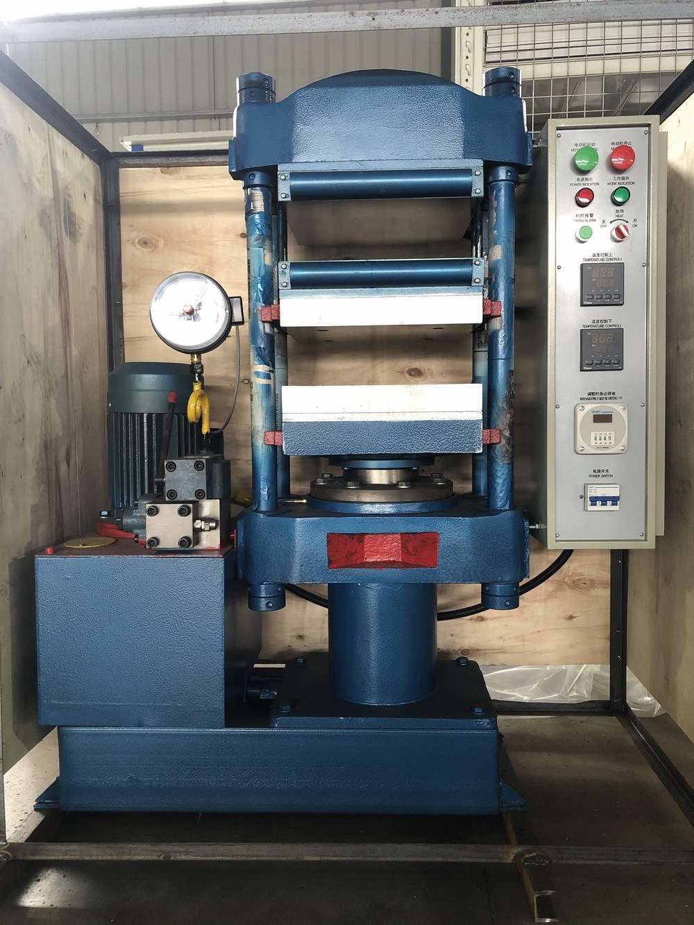 平板硫化機主要由主機、液壓系統(tǒng)、電控系統(tǒng)三大部分組成,油箱單獨安裝在主機左側(cè),不受熱板溫度的影響;操作閥安裝在主機左側(cè),工人操作方便、視覺寬敞;電控箱另行安裝于主機之右側(cè)。