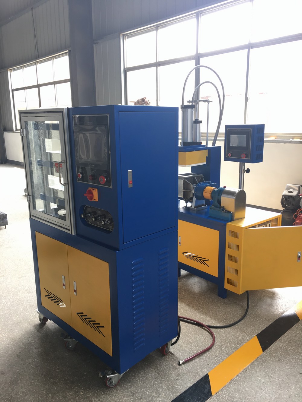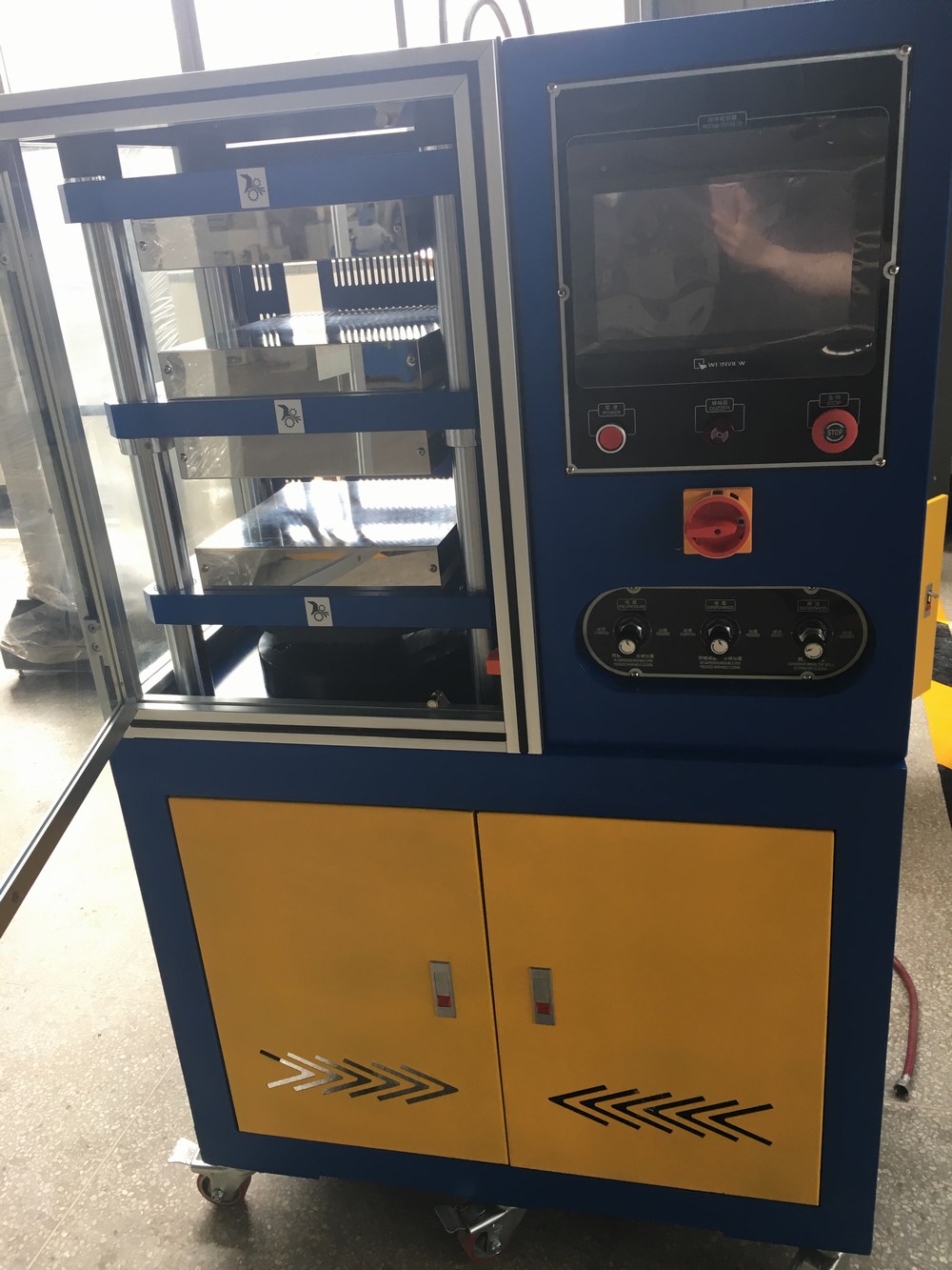 原料放于鑄模內(nèi),夾于本機(jī)電熱平板間加以壓力及溫度,使原料成型,以供試驗(yàn),做為工廠大量生產(chǎn)配料之依據(jù)。本機(jī)裝有 PLC 程序控制彩色觸摸屏,人機(jī)界面作業(yè)系統(tǒng)可設(shè)定壓力、溫度、時(shí)間和排氣次數(shù),硫化過程即時(shí)顯示和監(jiān)視,所設(shè)模壓程序全數(shù)自動完成。